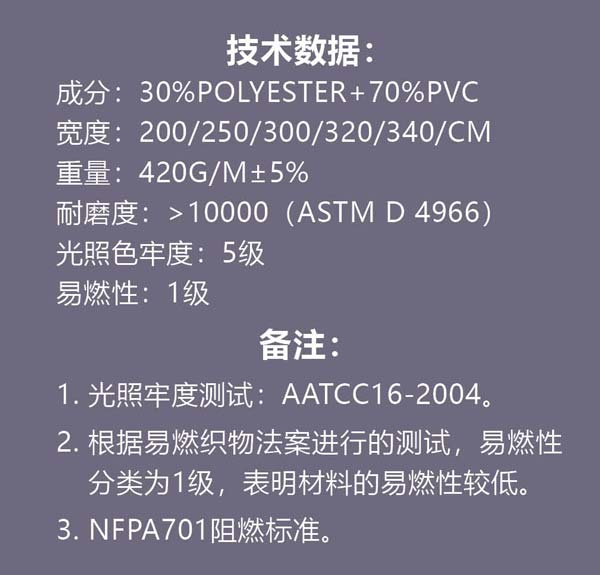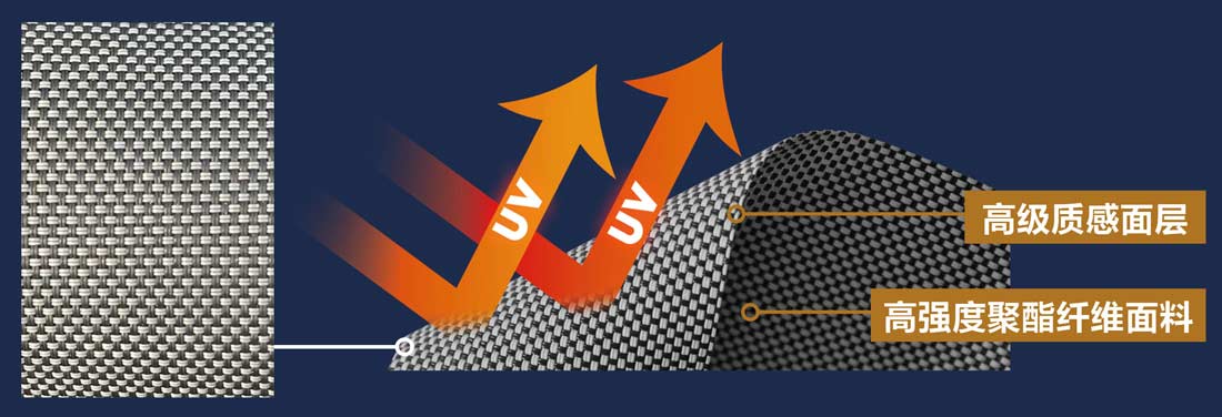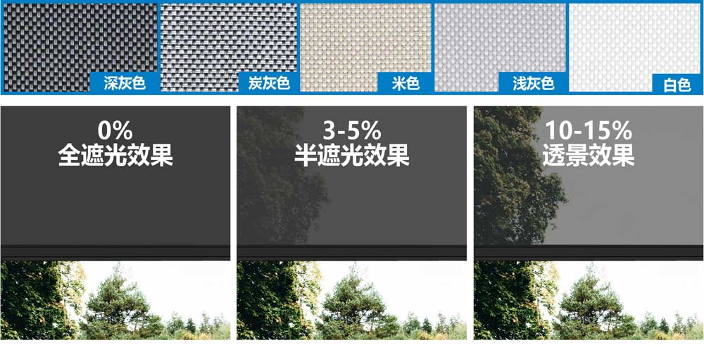 雅德阁智能防风卷帘 高级面料 品质保证 我们的面料采用国际品牌的聚酯纤维面料,耐热性强、抗腐蚀性好。除了防紫外线(UV)功能外,还采用了高级材料,具有防水、阻燃、防尘、防蚊等多重功能,确保您的户外环境干净、舒适和安全。此外,我们的产品还环保无甲醛,为您提供更健康的户外生活环境。 不同面料 不同进光量